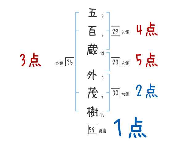 人運![]() | 五百蔵外茂樹さんの人運は23画の5つ星!想像力に優れ活力がある。一代で成功し名誉を手に入れる。 性格や才能などを表す2番目に重要な運勢です。人間関係や協調性、社会的な成功に影響します。主に20歳から50歳ぐらいまでの中年期の運勢を表します。 |