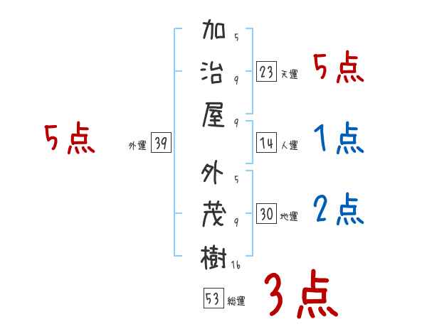 外運![]() | 加治屋外茂樹さんの外運は39画の5つ星!社交性に優れ人望が厚い。人の上に立ち成功する。 生活面を象徴する運勢です。外部から受ける影響力を表し、結婚運、家庭運や職場、環境への順応性を表します。 |