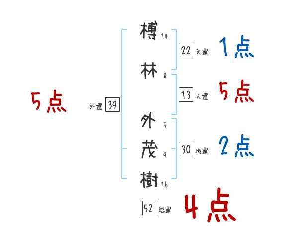 外運![]() | 榑林外茂樹さんの外運は39画の5つ星!社交性に優れ人望が厚い。人の上に立ち成功する。 生活面を象徴する運勢です。外部から受ける影響力を表し、結婚運、家庭運や職場、環境への順応性を表します。 |