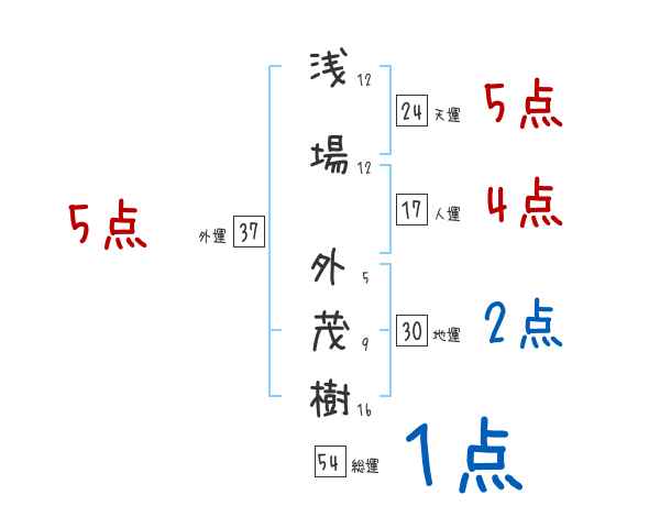天運![]() | 浅場外茂樹さんの天運は24画の5つ星!家庭運が良く順調な人生。金運にも恵まれる。 家系が持つ宿命的な運勢を表します。祖先から受け継いだ苗字ですので自分の力が及びません。家柄を象徴します。 |
