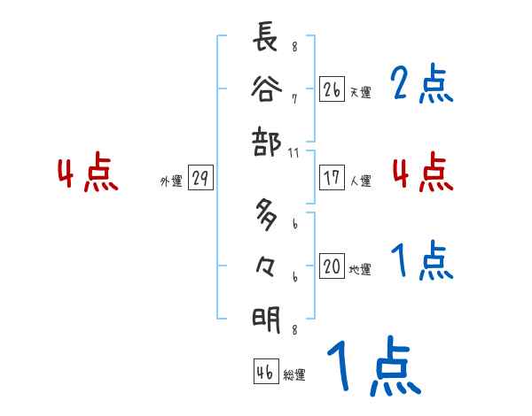天運![]() | 長谷部多々明さんの天運は26画の2つ星!波瀾万丈かも。信頼できる人を大事にしましょう。 家系が持つ宿命的な運勢を表します。祖先から受け継いだ苗字ですので自分の力が及びません。家柄を象徴します。 |