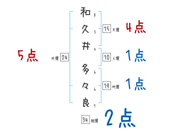 総運![]() | 和久井多々良さんの総運は34画の2つ星!独創性に優れるが、自尊心が強く災難に注意しましょう。 あなたの人生を表す1番重要な運勢です。生涯を通じて影響する総合運となり、主に50歳以降の晩年期に影響を及ぼします。 |