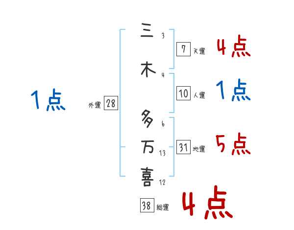 外運![]() | 三木多万喜さんの外運は28画の1つ星!家庭環境に注意。スポーツで活躍できる能力があるかも。 生活面を象徴する運勢です。外部から受ける影響力を表し、結婚運、家庭運や職場、環境への順応性を表します。 |