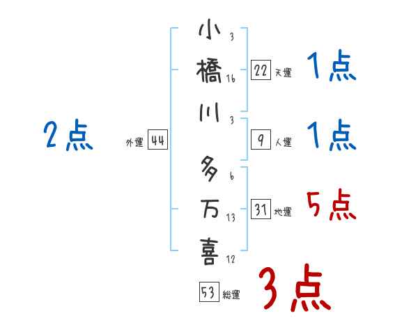 外運![]() | 小橋川多万喜さんの外運は44画の2つ星!誠実で慎重な性格。物事を考えすぎないように注意しましょう。 生活面を象徴する運勢です。外部から受ける影響力を表し、結婚運、家庭運や職場、環境への順応性を表します。 |
