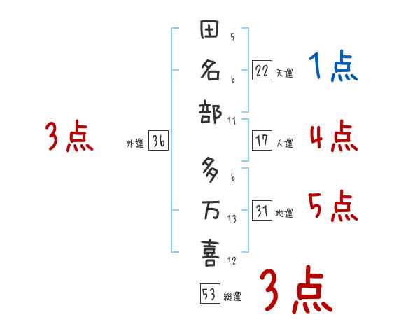 総運![]() | 田名部多万喜さんの総運は53画の3つ星!やや見栄っ張りで虚栄心がある。散財に注意。 あなたの人生を表す1番重要な運勢です。生涯を通じて影響する総合運となり、主に50歳以降の晩年期に影響を及ぼします。 |