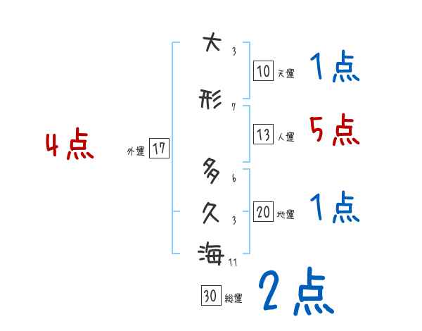 天運![]() | 大形多久海さんの天運は10画の1つ星!不安を感じやすい傾向。ストレスを抱えないように注意しましょう。 家系が持つ宿命的な運勢を表します。祖先から受け継いだ苗字ですので自分の力が及びません。家柄を象徴します。 |