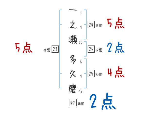 総運![]() | 一之瀬多久磨さんの総運は49画の2つ星!不安定な性格で明暗がある人生。周りの人には支援されやすい。 あなたの人生を表す1番重要な運勢です。生涯を通じて影響する総合運となり、主に50歳以降の晩年期に影響を及ぼします。 |