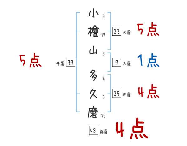 外運![]() | 小檜山多久磨さんの外運は39画の5つ星!社交性に優れ人望が厚い。人の上に立ち成功する。 生活面を象徴する運勢です。外部から受ける影響力を表し、結婚運、家庭運や職場、環境への順応性を表します。 |