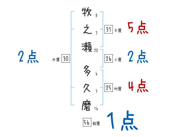総運![]() | 牧之瀬多久磨さんの総運は56画の1つ星!消極的で無気力になりがち。誠実な気持ちが必要でしょう。 あなたの人生を表す1番重要な運勢です。生涯を通じて影響する総合運となり、主に50歳以降の晩年期に影響を及ぼします。 |