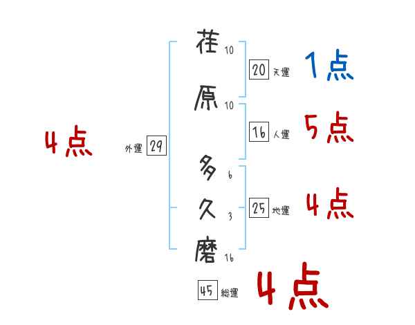 総運![]() | 荏原多久磨さんの総運は45画の4つ星!もくもくと物事を進め達成する。地味な努力家。 あなたの人生を表す1番重要な運勢です。生涯を通じて影響する総合運となり、主に50歳以降の晩年期に影響を及ぼします。 |