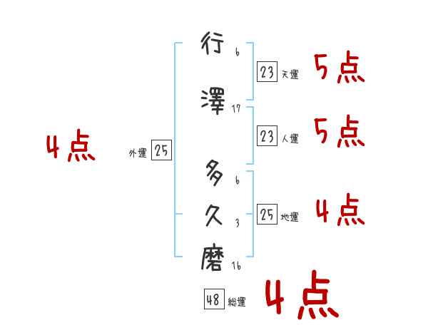 人運![]() | 行澤多久磨さんの人運は23画の5つ星!想像力に優れ活力がある。一代で成功し名誉を手に入れる。 性格や才能などを表す2番目に重要な運勢です。人間関係や協調性、社会的な成功に影響します。主に20歳から50歳ぐらいまでの中年期の運勢を表します。 |
