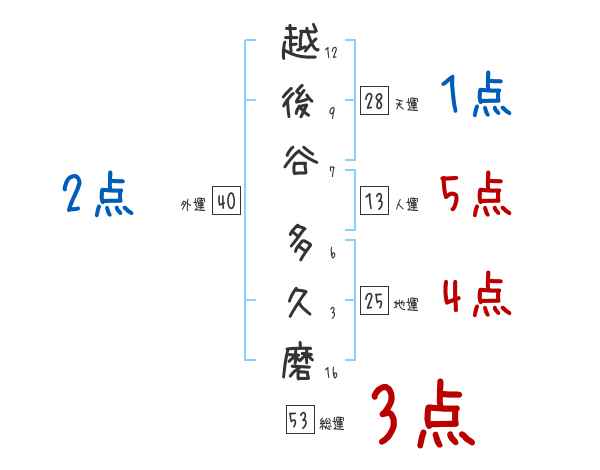 総運![]() | 越後谷多久磨さんの総運は53画の3つ星!やや見栄っ張りで虚栄心がある。散財に注意。 あなたの人生を表す1番重要な運勢です。生涯を通じて影響する総合運となり、主に50歳以降の晩年期に影響を及ぼします。 |