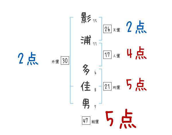 総運![]() | 影浦多佳男さんの総運は47画の5つ星!実力が開花し発展する円満な人生。財に恵まれる。 あなたの人生を表す1番重要な運勢です。生涯を通じて影響する総合運となり、主に50歳以降の晩年期に影響を及ぼします。 |