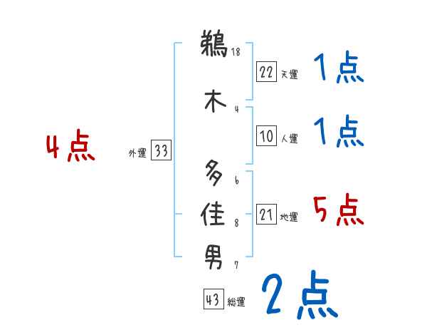 総運![]() | 鵜木多佳男さんの総運は43画の2つ星!頑固な性格で独立心が強いかも。やや非現実的で浪費に注意しましょう。 あなたの人生を表す1番重要な運勢です。生涯を通じて影響する総合運となり、主に50歳以降の晩年期に影響を及ぼします。 |