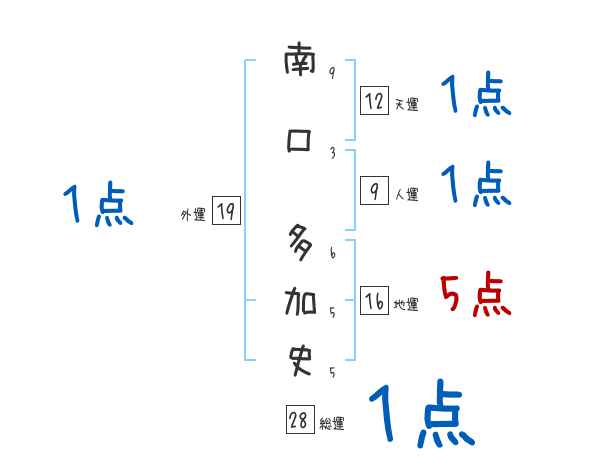 地運![]() | 南口多加史さんの地運は16画の5つ星!人望が厚く大きく発展する。逆転成功が見える。 個性を表す基礎的な運勢です。性格形成や対人関係、行動力など家庭環境に影響されます。主に誕生してから20歳くらいまでの若年期の運勢を表します。 |