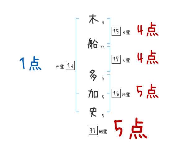 地運![]() | 木船多加史さんの地運は16画の5つ星!人望が厚く大きく発展する。逆転成功が見える。 個性を表す基礎的な運勢です。性格形成や対人関係、行動力など家庭環境に影響されます。主に誕生してから20歳くらいまでの若年期の運勢を表します。 |