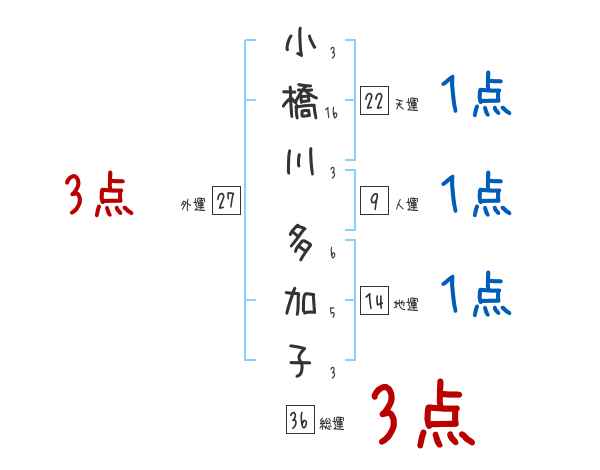 総運![]() | 小橋川多加子さんの総運は36画の3つ星!先見性が豊かです。多少神経質で苦労することも。 あなたの人生を表す1番重要な運勢です。生涯を通じて影響する総合運となり、主に50歳以降の晩年期に影響を及ぼします。 |