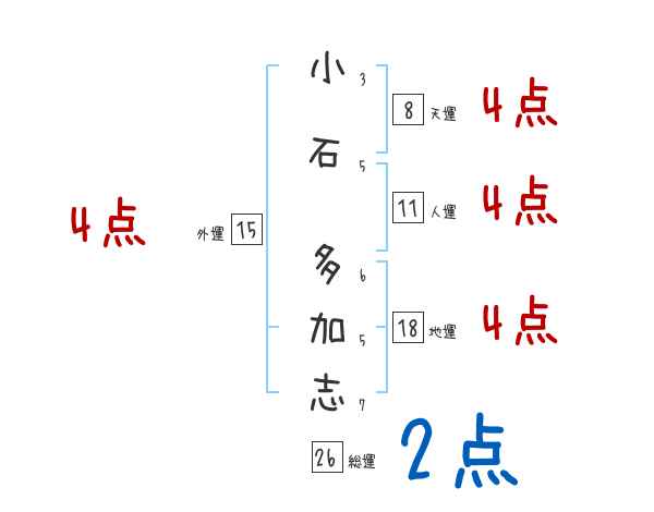 人運![]() | 小石多加志さんの人運は11画の4つ星!着実に富や地位を得る幸運な人生。 性格や才能などを表す2番目に重要な運勢です。人間関係や協調性、社会的な成功に影響します。主に20歳から50歳ぐらいまでの中年期の運勢を表します。 |