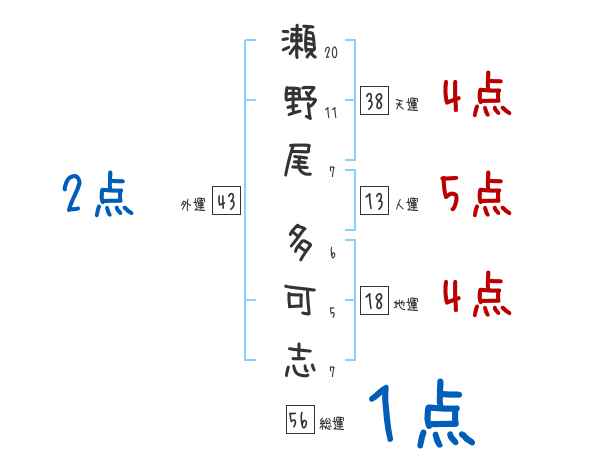 瀬野尾多可志さんの画数の鑑定結果