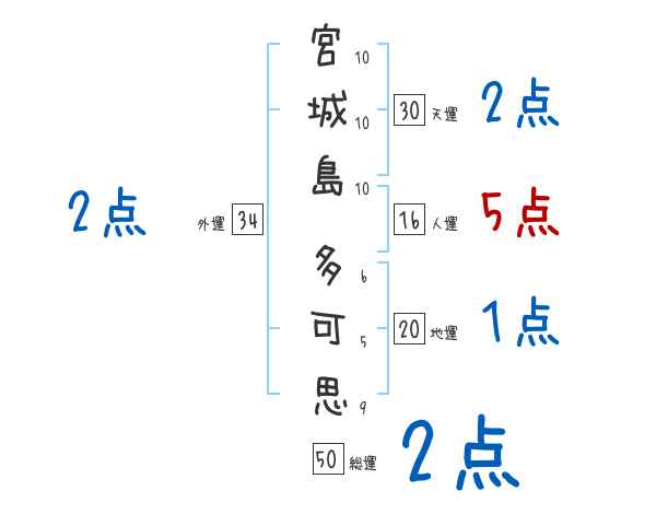 天運![]() | 宮城島多可思さんの天運は30画の2つ星!浮き沈みの激しさに注意しましょう。 家系が持つ宿命的な運勢を表します。祖先から受け継いだ苗字ですので自分の力が及びません。家柄を象徴します。 |