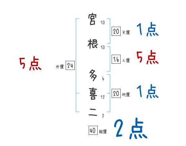 宮根多喜二さんの画数の鑑定結果