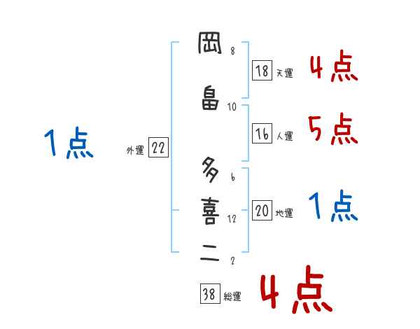 外運![]() | 岡畠多喜二さんの外運は22画の1つ星!努力することが苦手ないっぽう手先が器用。芸術性にも優れる。 生活面を象徴する運勢です。外部から受ける影響力を表し、結婚運、家庭運や職場、環境への順応性を表します。 |