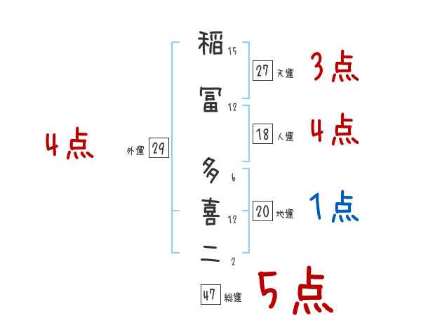 外運![]() | 稲冨多喜二さんの外運は29画の4つ星!完全主義で才能がある。厳格な心の持ち主。 生活面を象徴する運勢です。外部から受ける影響力を表し、結婚運、家庭運や職場、環境への順応性を表します。 |