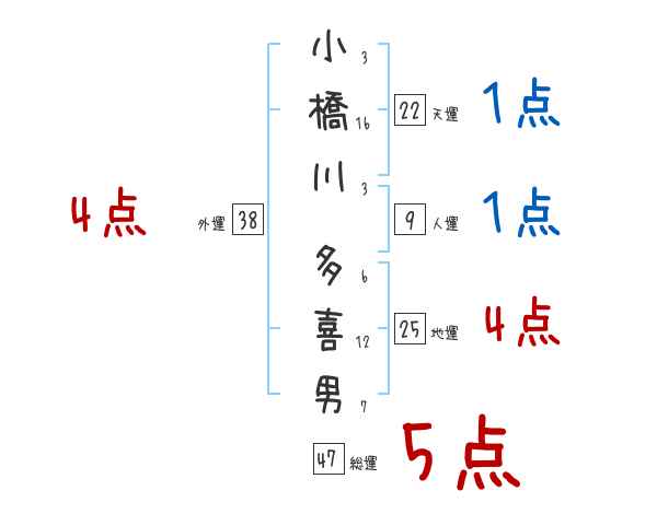 天運![]() | 小橋川多喜男さんの天運は22画の1つ星!努力することが苦手ないっぽう手先が器用。芸術性にも優れる。 家系が持つ宿命的な運勢を表します。祖先から受け継いだ苗字ですので自分の力が及びません。家柄を象徴します。 |