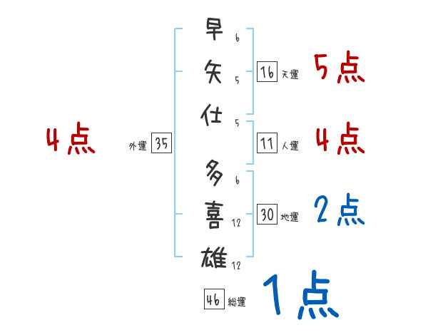 外運![]() | 早矢仕多喜雄さんの外運は35画の4つ星!温厚な性格で感受性が高い。穏和な性格で人望が厚い。 生活面を象徴する運勢です。外部から受ける影響力を表し、結婚運、家庭運や職場、環境への順応性を表します。 |