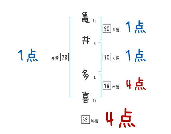 外運![]() | 亀井多喜さんの外運は28画の1つ星!家庭環境に注意。スポーツで活躍できる能力があるかも。 生活面を象徴する運勢です。外部から受ける影響力を表し、結婚運、家庭運や職場、環境への順応性を表します。 |