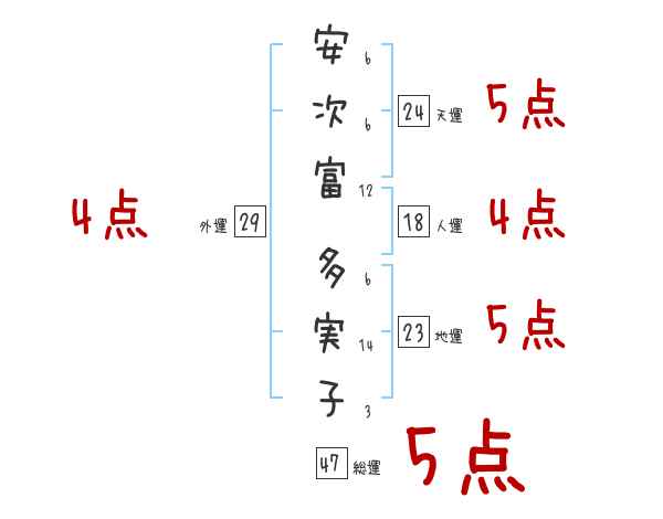 総運![]() | 安次富多実子さんの総運は47画の5つ星!実力が開花し発展する円満な人生。財に恵まれる。 あなたの人生を表す1番重要な運勢です。生涯を通じて影響する総合運となり、主に50歳以降の晩年期に影響を及ぼします。 |
