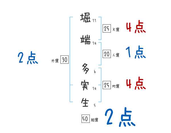 外運![]() | 堀端多実生さんの外運は30画の2つ星!浮き沈みの激しさに注意しましょう。 生活面を象徴する運勢です。外部から受ける影響力を表し、結婚運、家庭運や職場、環境への順応性を表します。 |
