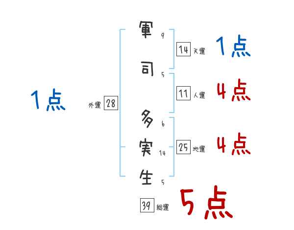 総運![]() | 軍司多実生さんの総運は39画の5つ星!社交性に優れ人望が厚い。人の上に立ち成功する。 あなたの人生を表す1番重要な運勢です。生涯を通じて影響する総合運となり、主に50歳以降の晩年期に影響を及ぼします。 |