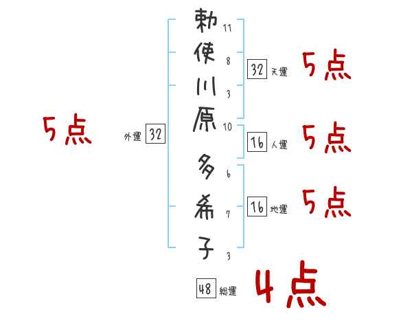 外運![]() | 勅使川原多希子さんの外運は32画の5つ星!柔軟性があり成功する。チャンスが多く金運が良い。 生活面を象徴する運勢です。外部から受ける影響力を表し、結婚運、家庭運や職場、環境への順応性を表します。 |