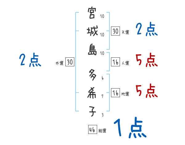 人運![]() | 宮城島多希子さんの人運は16画の5つ星!人望が厚く大きく発展する。逆転成功が見える。 性格や才能などを表す2番目に重要な運勢です。人間関係や協調性、社会的な成功に影響します。主に20歳から50歳ぐらいまでの中年期の運勢を表します。 |