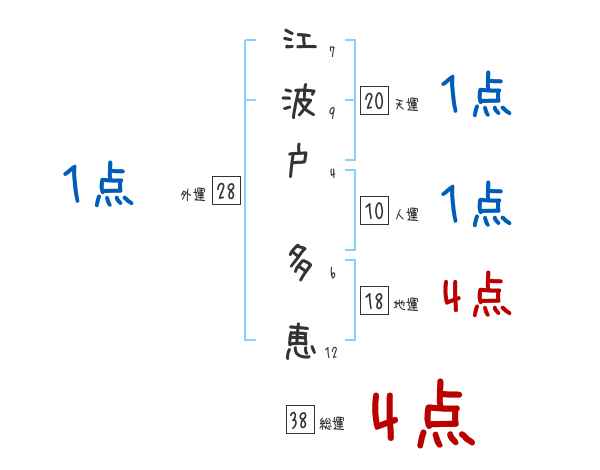 外運![]() | 江波戸多恵さんの外運は28画の1つ星!家庭環境に注意。スポーツで活躍できる能力があるかも。 生活面を象徴する運勢です。外部から受ける影響力を表し、結婚運、家庭運や職場、環境への順応性を表します。 |