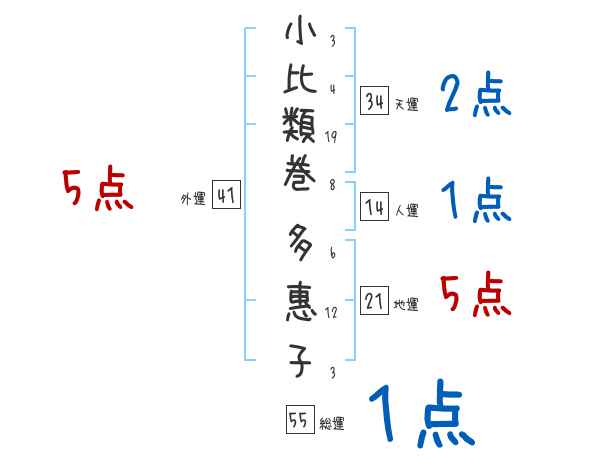 天運![]() | 小比類巻多惠子さんの天運は34画の2つ星!独創性に優れるが、自尊心が強く災難に注意しましょう。 家系が持つ宿命的な運勢を表します。祖先から受け継いだ苗字ですので自分の力が及びません。家柄を象徴します。 |
