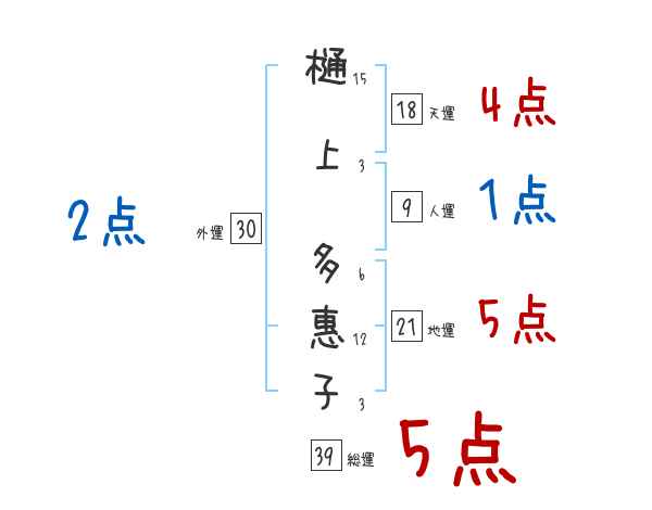 総運![]() | 樋上多惠子さんの総運は39画の5つ星!社交性に優れ人望が厚い。人の上に立ち成功する。 あなたの人生を表す1番重要な運勢です。生涯を通じて影響する総合運となり、主に50歳以降の晩年期に影響を及ぼします。 |