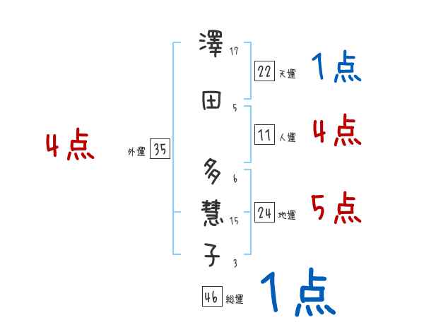 外運![]() | 澤田多慧子さんの外運は35画の4つ星!温厚な性格で感受性が高い。穏和な性格で人望が厚い。 生活面を象徴する運勢です。外部から受ける影響力を表し、結婚運、家庭運や職場、環境への順応性を表します。 |