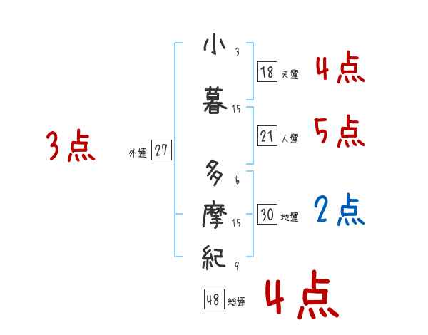 天運![]() | 小暮多摩紀さんの天運は18画の4つ星!情熱的で剛気。忍耐力があり信頼される。 家系が持つ宿命的な運勢を表します。祖先から受け継いだ苗字ですので自分の力が及びません。家柄を象徴します。 |