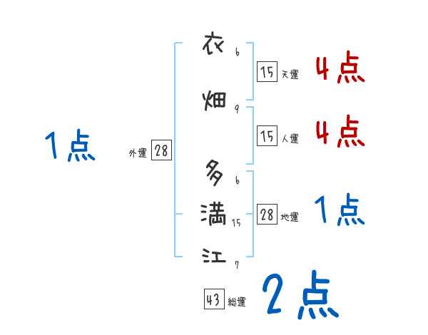 総運![]() | 衣畑多満江さんの総運は43画の2つ星!頑固な性格で独立心が強いかも。やや非現実的で浪費に注意しましょう。 あなたの人生を表す1番重要な運勢です。生涯を通じて影響する総合運となり、主に50歳以降の晩年期に影響を及ぼします。 |