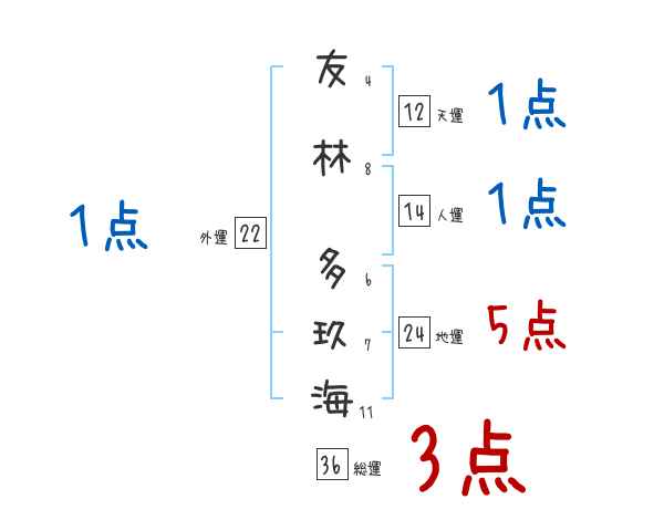 総運![]() | 友林多玖海さんの総運は36画の3つ星!先見性が豊かです。多少神経質で苦労することも。 あなたの人生を表す1番重要な運勢です。生涯を通じて影響する総合運となり、主に50歳以降の晩年期に影響を及ぼします。 |