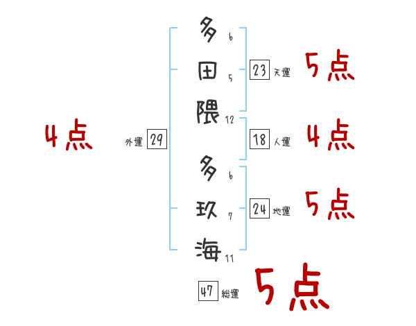 総運![]() | 多田隈多玖海さんの総運は47画の5つ星!実力が開花し発展する円満な人生。財に恵まれる。 あなたの人生を表す1番重要な運勢です。生涯を通じて影響する総合運となり、主に50歳以降の晩年期に影響を及ぼします。 |