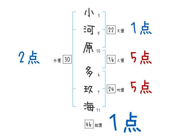 天運![]() | 小河原多玖海さんの天運は22画の1つ星!努力することが苦手ないっぽう手先が器用。芸術性にも優れる。 家系が持つ宿命的な運勢を表します。祖先から受け継いだ苗字ですので自分の力が及びません。家柄を象徴します。 |