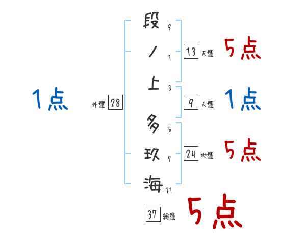 総運![]() | 段ノ上多玖海さんの総運は37画の5つ星!努力家で順応性に優れる。現実的な考え方ができ忠実に物事をこなす。 あなたの人生を表す1番重要な運勢です。生涯を通じて影響する総合運となり、主に50歳以降の晩年期に影響を及ぼします。 |