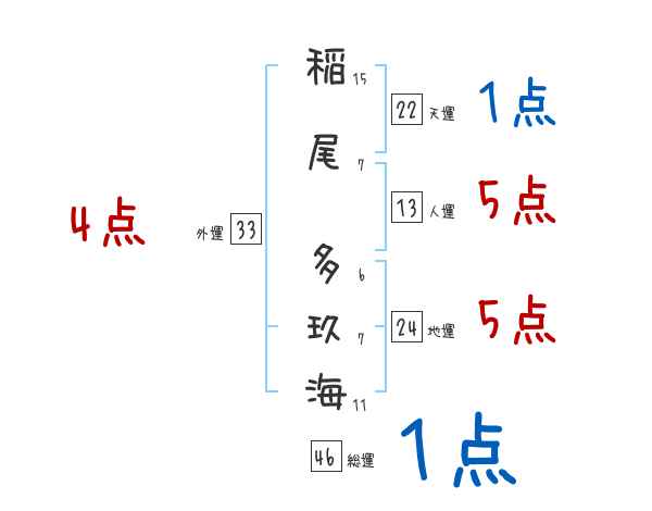 外運![]() | 稲尾多玖海さんの外運は33画の4つ星!権力志向でプライドが高い。勇気があり運を切り開き成功する。 生活面を象徴する運勢です。外部から受ける影響力を表し、結婚運、家庭運や職場、環境への順応性を表します。 |