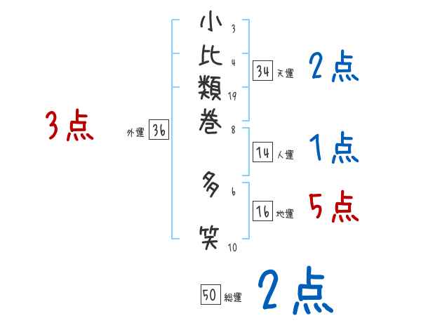 天運![]() | 小比類巻多笑さんの天運は34画の2つ星!独創性に優れるが、自尊心が強く災難に注意しましょう。 家系が持つ宿命的な運勢を表します。祖先から受け継いだ苗字ですので自分の力が及びません。家柄を象徴します。 |