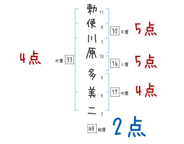 人運![]() | 勅使川原多美二さんの人運は16画の5つ星!人望が厚く大きく発展する。逆転成功が見える。 性格や才能などを表す2番目に重要な運勢です。人間関係や協調性、社会的な成功に影響します。主に20歳から50歳ぐらいまでの中年期の運勢を表します。 |