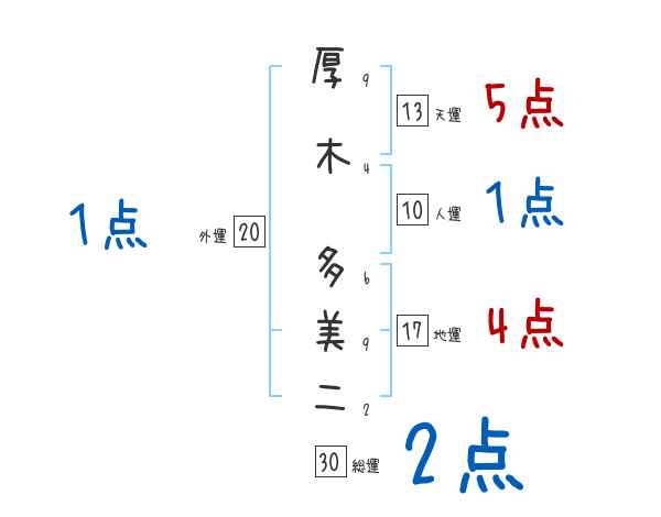 天運![]() | 厚木多美二さんの天運は13画の5つ星!才能に恵まれ人気がある。名声を手に入れる。円満な人生。 家系が持つ宿命的な運勢を表します。祖先から受け継いだ苗字ですので自分の力が及びません。家柄を象徴します。 |