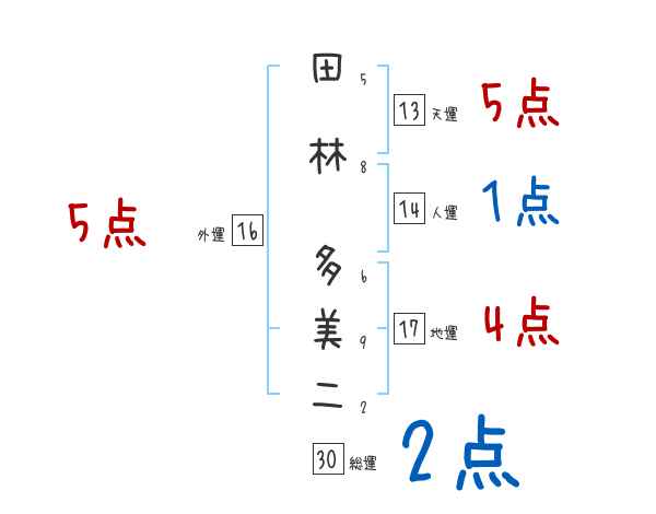 外運![]() | 田林多美二さんの外運は16画の5つ星!人望が厚く大きく発展する。逆転成功が見える。 生活面を象徴する運勢です。外部から受ける影響力を表し、結婚運、家庭運や職場、環境への順応性を表します。 |